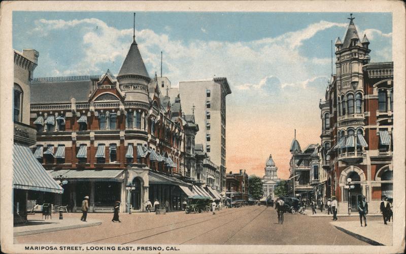 Front: AL STABLISHED 882 FIRST NATIONA MARIPOSA STREET, LOOKING EAST, FRESNO, CAL. 12: 20 Back: C..T. AM ERICAN ART A-59446 POSTY ختار THIS SPACE FOR ADDRESS ONLY.