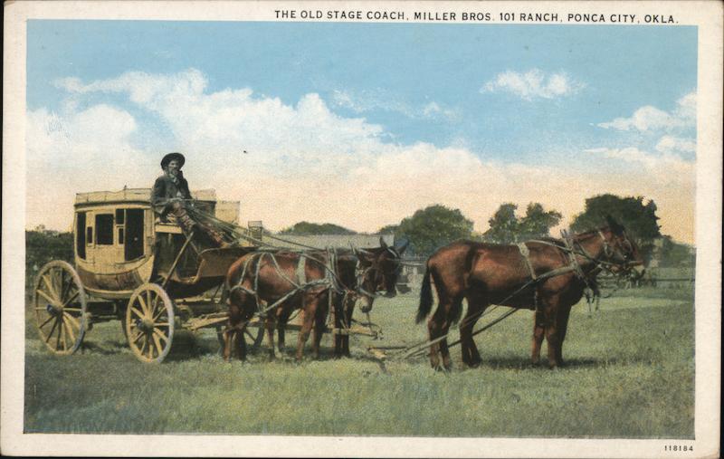 Front: THE OLD STAGE COACH, MILLER BROS. 101 RANCH, PONCA CITY, OKLA. 118184 Back: o 4/13 MADE BY CURT TEICH & CO., INC., CHICAGO, U.S.A. CHICAGO HERE