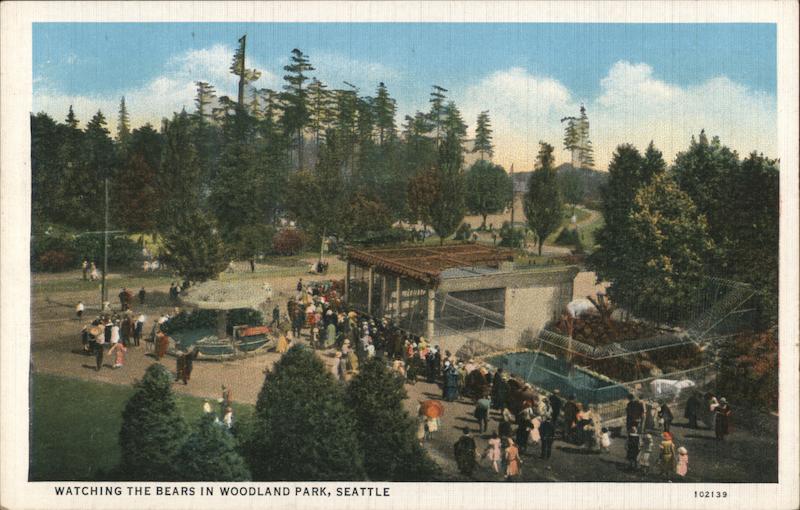 Front: WATCHING THE BEARS IN WOODLAND PARK, SEATTLE imm 11 102139 Back: 3041 C. P. JOHNSTON CO., SEATTLE, U. S. A. C. T. AMERICAN ART COLORED CHIC CO HERE