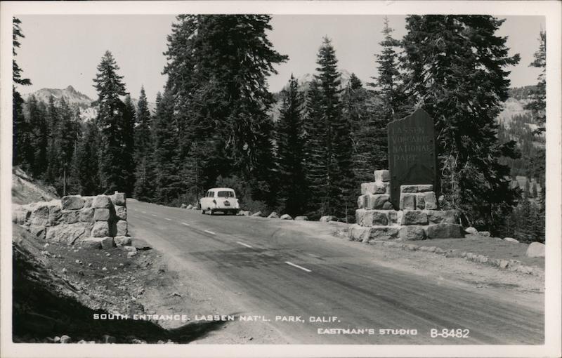 Front: SOUTH ENTRANCE. LASSEN NAT'L. PARK, CALIF. LASSEN VOLCANIC NATIONAL PARK EASTMAN'S STUDIO B-8482 Back: DEVOLITE PEERLESS