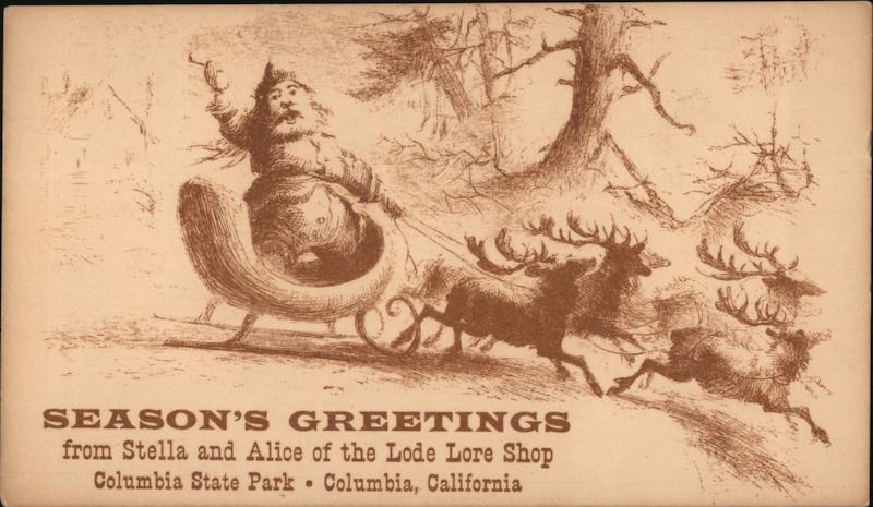 Front: SEASON'S GREETINGS from Stella and Alice of the Lode Lore Shop Columbia State Park Columbia, California 14 Back: Authorized by Act of Congress of May 19, 1898