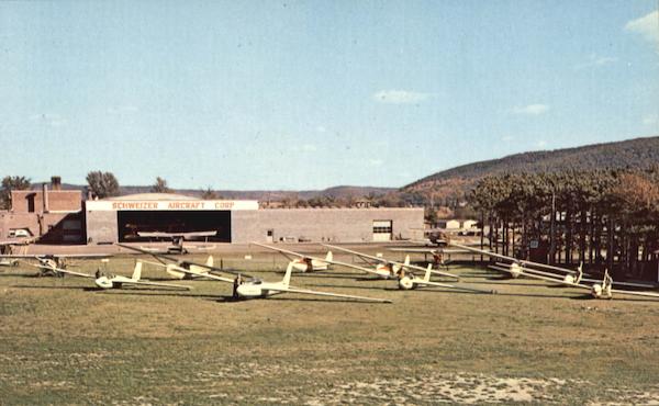| Located on the east side of the Chemung Country Airport, Sailplanes and town planes shown in front of the Schweitzer Aircraft plant are regular school equipment. Complete courses are available for rated power pilots or beginners. Visitors are welcome and can take introductory sailplane flights over famous Harris Hill. |