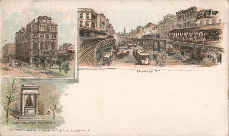 地址 MA AAAA COOPER INSTITUTE PETER COOPER MONUMENT. COPYRIGHT 1898, BY H.A.ROST PRTG, & PUBL. CO., N.Y.- No. 19. Bowery, N.Y. mell Bott