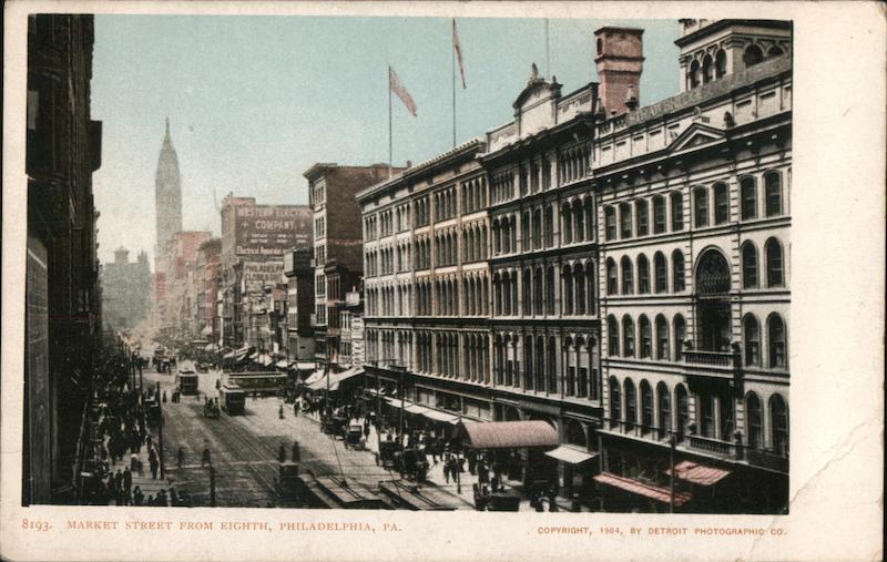 Front: WESTERN ELECTR COMPANY Electrical s PHILADELPH CLAAKS SUIT 8193. MARKET STREET FROM EIGHTH, PHILADELPHIA, PA. ATTEN EX COPYRIGHT, 1904, BY DETROIT PHOTOGRAPHIC CO. Back: AND CANADA, FOREIGN, TWO CENTS.
