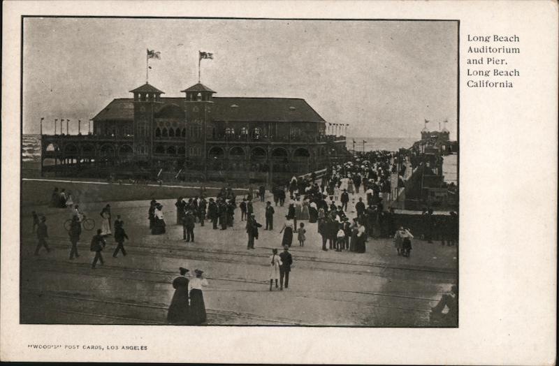 Front: "WOOD'S POST CARDS, LOS ANGELES Long Beach Auditorium and Pier. Long Beach California Back: Sum Post ard 200 TWO CENTS