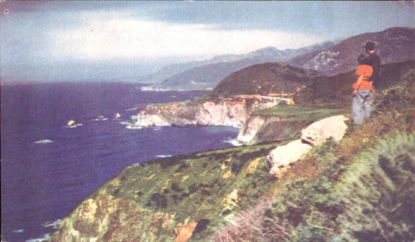 | This breath-taking vista of the Pacific coastline is near the Bixby Creek bridge on the San Simeon Highway south of Monterey. Calif. One of the many spectacular bridges on the more than 100 miles of scenic highway, Bixby Creek span is representative of the engineering skill which went into the construction of the spectacular drive. |