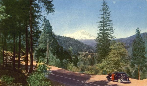 | Mt. Shasta, as seen from U.S. 99 along the Sacramento River, presents its snowcapped crest to the sky. From its 14,162-foot peak you may look over into Oregon on the north and on all sides behold a vista long to be remembered. It is a favorite mountain of alpinists. |