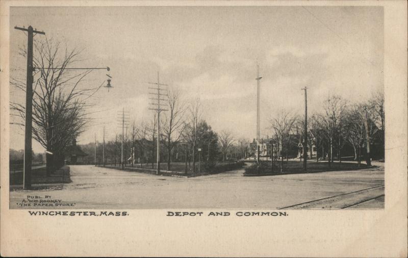 Front: PUBL. BY A.W ROONEY "THE PAPER STORE WINCHESTER, MASS. DEPOT AND COMMON. Back: Domestic 1 Ct. Foreign 2 Cts. THE ALBERTYPE GO.! BROOKLYN, N.Y.