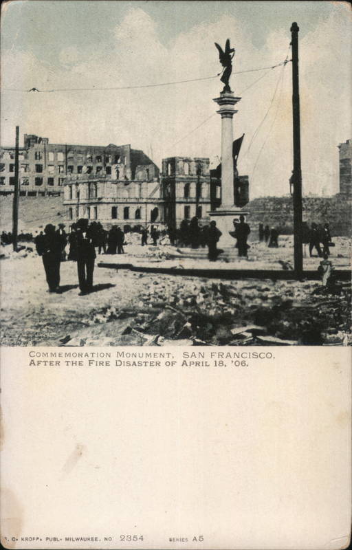 Front: COMMEMORATION MONUMENT, SAN FRANCISCO, AFTER THE FIRE DISASTER OF APRIL 18, '06. 3. C. KROPP. PUBL. MILWAUKEE, NO: 2354 SERIES A5 14 Back: Post Gard FOR EIGN TWO CENTS