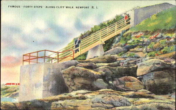 Front: FAMOUS FORTY STEPS ALONG CLIFF WALK. NEWPORT R. I. Back: (HIS SPACE FOR WRITING MESSAGES COLOURPICTURE" PUBLICATION PUBLISHED BY H. B. SETTLE CO., NEWPORT, R.I. BOSTON 15 MASS., U. S. A