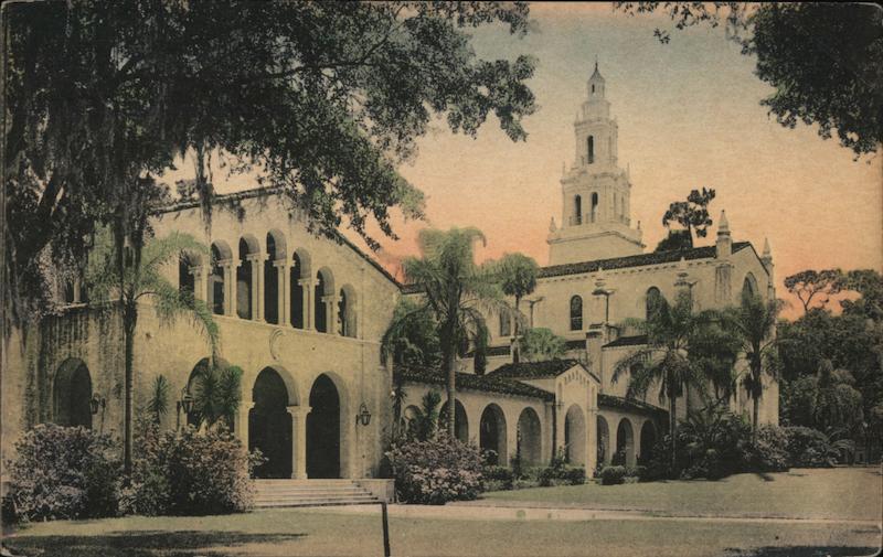 WP-12 Annie Russell Theatre and Knowles Memorial Chapel, Rollins College, Winter Park, Fla. MFG. BY SUNNY SCENES, INC., WINTER PARK, FLA. HAND-COLORED POST CARD