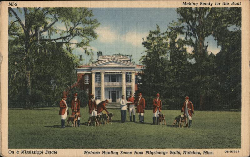 Front: MI-9 On a Mississippi Estate *** Making Ready for the Hunt Melrose Hunting Scene from Pilgrimage Balls, Natchez, Miss. OB-H1334 Back: GENUINE CURTEICH-CHICAGO "C.T. ART-COLORTONE" POST CARD (REG. U.S. PAT. OFF.) 10 7