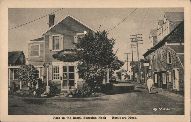 Front: The PEWTER 21 106 Fork in the Road, Bearskin Neck Rockport, Mass. ALLEYE low-IND ⒸV.C.L. Back: COPYRIGHTED BY VIRGINIA CLEAVES LITTLE, ROCKPORT, MASS. THE FINEST AMERICAN MADE VIEW POST CARDS THE ALBERTYPE CO., BROOKLYN, N. Y. POST CARD