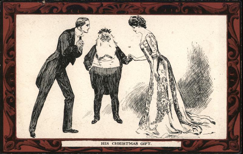 Front: 19 S 3 HIS CHRISTMAS GIFT. OG *10* prez 50 Back: "Pictorial Comedy" Post Cards-C.D. Gibson's Drawings-No 50 COMMUNICATION - INLAND POSTAGE ONLY (Post Office Regulation). 1½ d STAMP. Id. PRINTED IN SAXONY.
