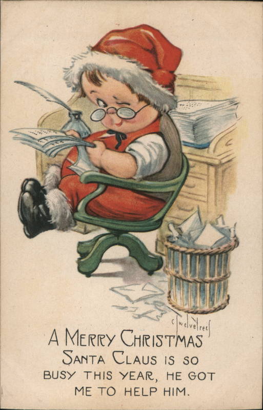 Front: *** ما الله cfwelvetreef A MERRY CHRISTMAS SANTA CLAUS IS SO BUSY THIS YEAR, HE GOT ME TO HELP HIM. Back: CORRESPONDENCE. SodearCharlie Drommadeline No. 1034 Dec 1918 Wishing you all happiness 10- 791k