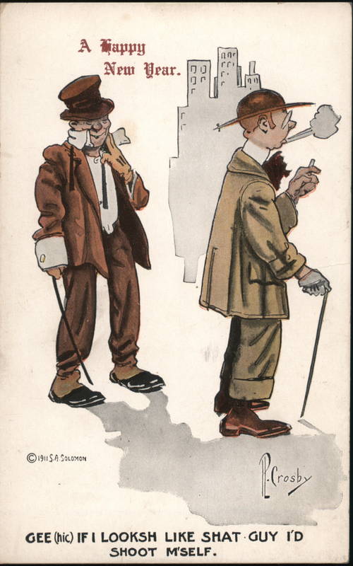 Front: A Happy 1911 S.A. SOLOMON New Year. Anr 'ri 34 •Crosby GEE (hic) IF I LOOKSH LIKE SHAT GUY I'D SHOOT M'SELF. Back: FOR ÅDDRESS ONLY. 4.00 FOREIGN, TWO CENTS.
