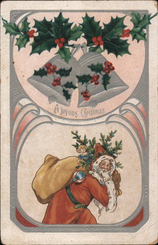 Santa Claus Carrying Sack of Toys with Bells and Holly Above
