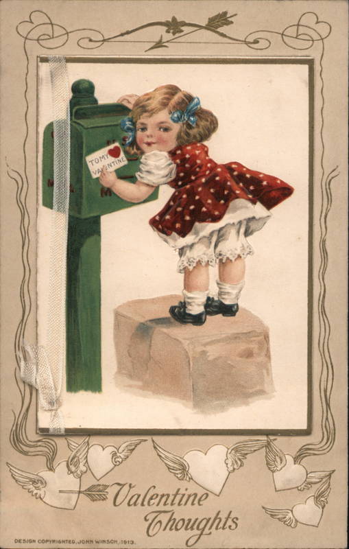 Front: Do TOMY VALENTINE Valentine Thoughts DESIGN COPYRIGHTED, JOHN WINSCH, 1913. 50 Back: 300 Feb. 14/9 Maggie тад Cerma та 300 ON THIS SIDE. R. D. 4.8. Maggie Stabler Springfield Ⓒ