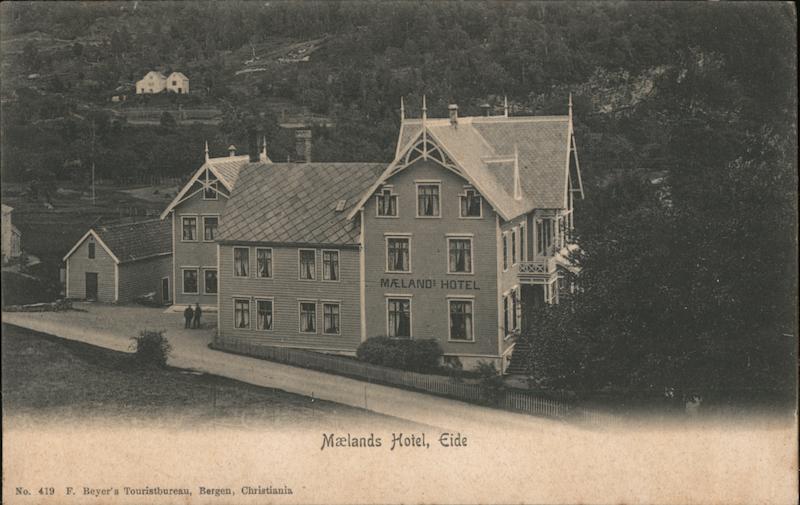 Front: No. 419 F. Beyer's Touristbureau, Bergen, Christiania MÆLAND HOTEL Mælands Hotel, Eide Back: A. J. K. B. Til VERDENSPOSTFORENINGEN. (UNION POSTALE UNIVERSELLE.) Brevkort fra Norge. (Norvège.) (Paa denne Side skrives kun Adressen.)