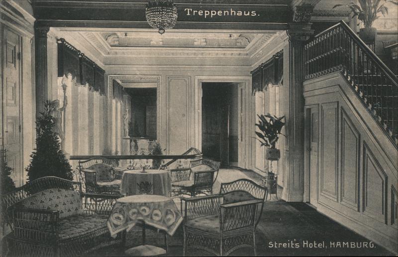 Front: GOTOODE Treppenhaus. DOXY Streit's Hotel, HAMBURG. Back: Verlag Gebr. Israel, Hamburg STREIT'S HOTEL, HAMBURG. (Nur für Adreffe.)