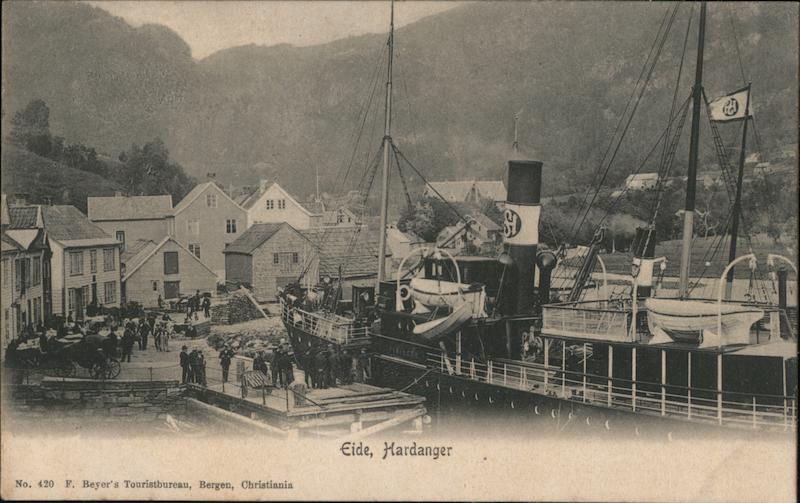Front: No. 420 F. Beyer's Touristbureau, Bergen, Christiania Eide, Hardanger SO CC Back: A. J. K. B Til VERDENSPOSTFORENINGEN. (UNION POSTALE UNIVERSELLE.) Brevkort fra Norge. (Norvège.) (Paa denne Side skrives kun Adressen.)