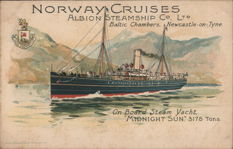 Front: ALSION MSNIP NORWAY CRUISES ANDY REID & CO.LTO NEWCASTLE ALBION STEAMSHIP Co. LTP Baltic Chambers. Newcastle-on-Tyne. 19 20 On Board Steam Yacht, "MIDNIGHT SUN, 3178 Tons. Back: THE ADDRESS ONLY TO BE WRITTEN ON THIS SIDE.