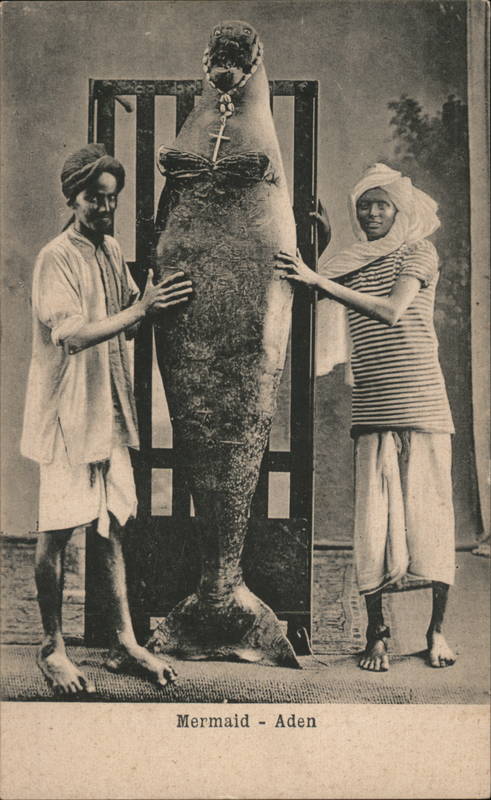 A famous postcard circa 1905 with 2 fisherman and a Dudong dressed up as mermaid