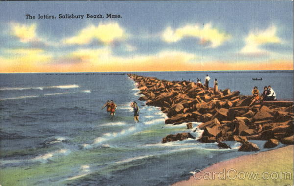 Front: The Jetties. Salisbury Beach. Mass. Back: 70125 'TICHNOR QUALITY VIEWS" REG. U. S. PAT. OFF. MADE ONLY BY TICHNOR BROS., INC., BOSTON, MASS. PWB. BY L. W. CLOUGH, SALISBURY BEACH. MASS.