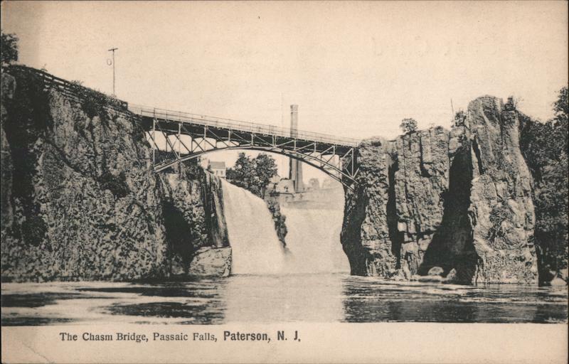 Front: to The Chasm Bridge, Passaic Falls, Paterson, N. J. Back: 9100 Imprint-Souvenir Post Card Co. New-York and Berlin. Post Card