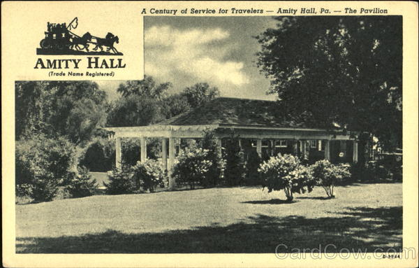 Front: A Century of Service for Travelers Amity Hall, Pa. The Pavilion AMITY HALL (Trade Name Registered) D-9544 Back: E. MADCIFF, HERSHEY, PA.