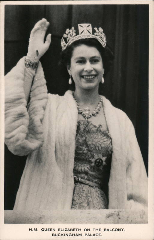 Front: H.M. QUEEN ELIZABETH ON THE BALCONY, BUCKINGHAM PALACE. Back: VALENTINE & SONS, LTD., DUNDEE AND LONDON. SENDING YOU GREETINGS Valentine's THIS IS A REAL PHOTOGRAPH ill E.R 18 GT. BRITAIN