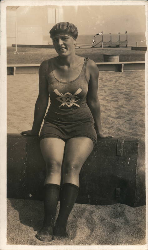 Woman in swim-cap and swimsuit sit on mental object on sand