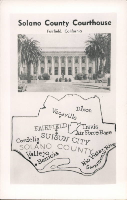 Front: Solano County Courthouse Fairfield, California US Vacaville Dixon FAIRFIELD ← Travis SUISUN CITY Air Force Base Benicia Cordelia SOLANO COUNTY Vallejo سے Rio Vista, Rive Sacramento Back: PHOTO POST-GARD Kodak Paper