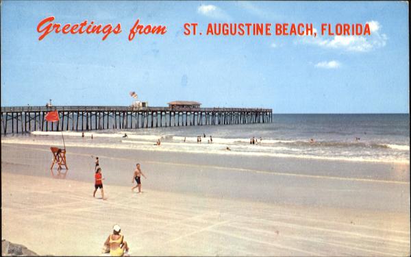 | Over 40 miles of unexcelled beach, offering swimming, sunbathing and surf casting. The Fishing Pier shown is Free, and has an excellent bait & tackle shop. Nearby are other amusements ad shops, making St. Augustine Beach the ideal place for family fun. |