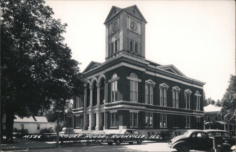 Front: M586 Soms CLUDATE ST 11 2.2 COURT HOUSE, RUSHVILLE, ILL. Back: Schuyler Co POST CARD E ALL RIGHTS RESERVED-THE L. L. COOK UKEE 1