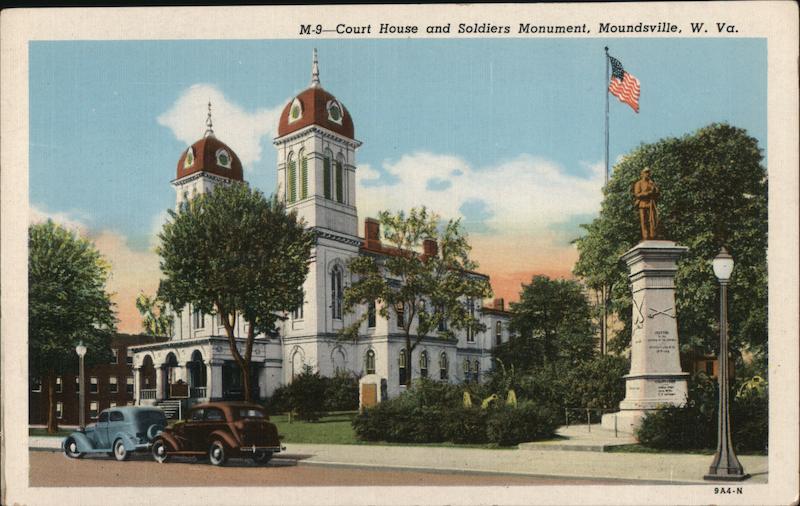 Front: M-9 Court House and Soldiers Monument, Moundsville, W. Va. *** 300www. ***** ***** XOA 9 A4-N Back: GENUINE CURTEICH-CHICAGO C.T. AMERICAN ART POST CARD (REG. U.S. PAT. OFF.) PLACE
