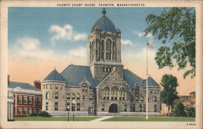 Front: COUNTY COURT HOUSE. TAUNTON. MASSACHUSETTS TE 113 E-5929 Back: AMERICAN ART POST CARD CO.. BOSTON, MASS. Co Bristol ܩܘ HERE