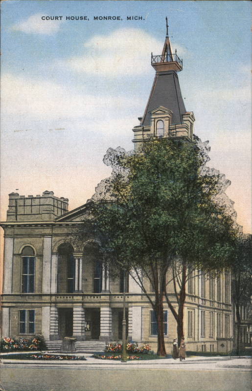 Front: COURT HOUSE, MONROE, MICH. 1:17 Back: 19407 monroe Co Co -PUB. BY E. F. HARKRADER, MONROE, MICH. NATURAL COLOR POST CARD MADE IN U. S. A. BY E. C. KROPРСО., MILWAUKEE, WIS..(BCL)