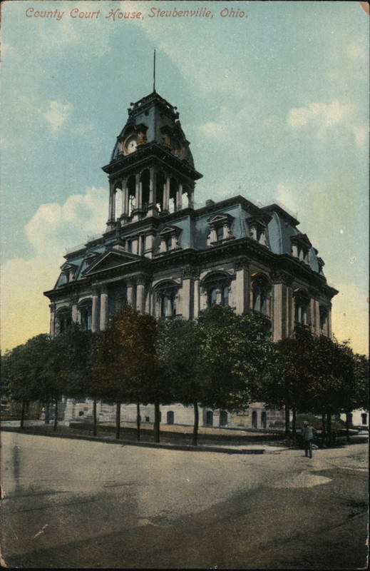 Front: County Court House, Steubenville, Ohio. AL 11. Back: D 5278 Published by J. Sulzbacher, Steubenville, Ohio. N. LEIPZIG BERLIN ARO COME DRESDEN 1,00 United States and Island Possession, Cuba, Canada and For all other Countries Two Cents