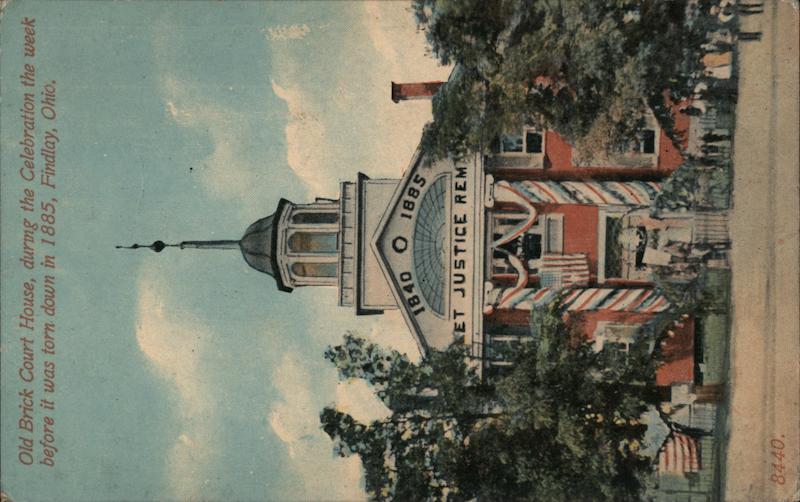 Front: Old Brick Court House, during the Celebration the week before it was torn down in 1885, Findlay, Ohio. 8440. 1840 O 1885 KET JUSTICE REM CAND life Back: Pub. expresslly for The F. W. Woolworth Co. Dy مالك STAMPHERE TWO CENTS