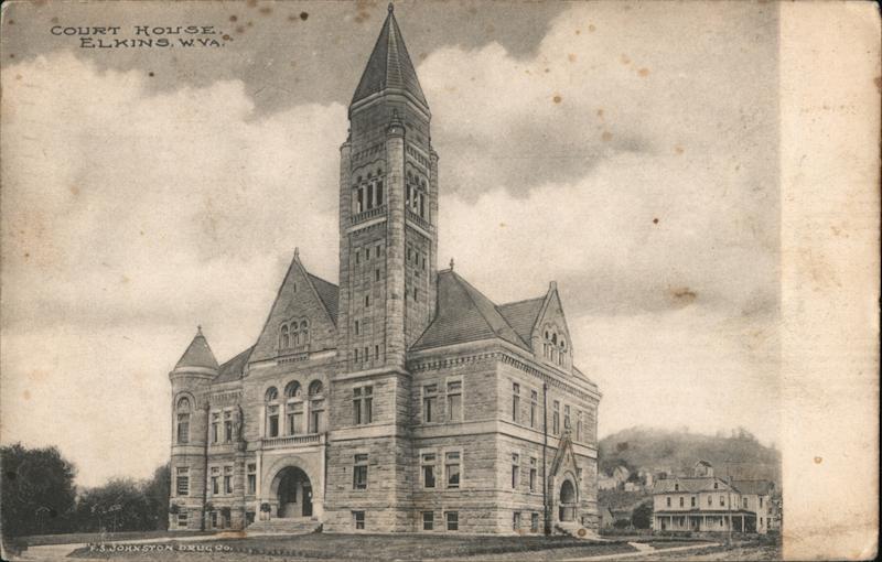 Front: COURT HOUSE. ELKINS, W. VA FE F.S.JOHNSTON DRUG Co, 23232 139 MT Back: 45 general *** ELKINS nu Marshall over, Del Mr. Stanly Elkins 7-3016 I am still work- in the Drug Ross Stone Jame Bre This winter again. going to