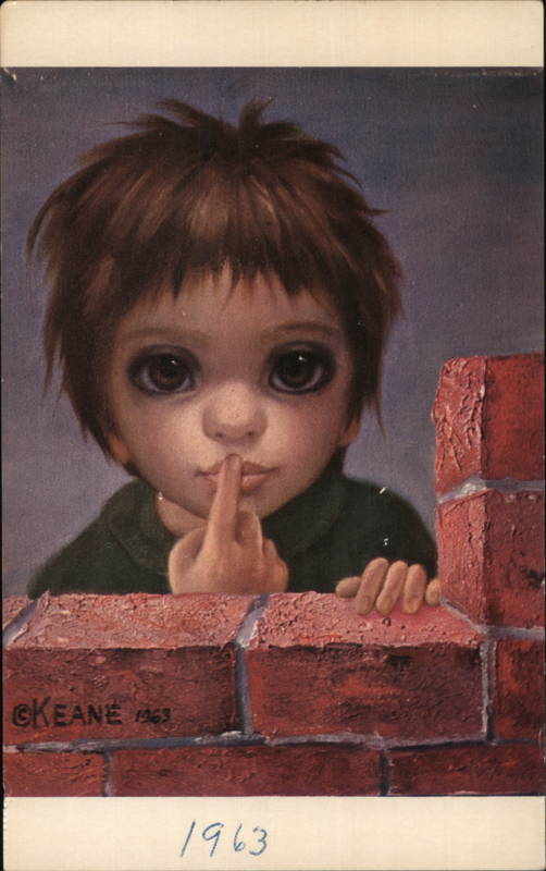 Front: GKEANE 1963 1963 I Back: 1963 Walter Keane - All rights reserved. From an oil painting "The Whisper" by Walter KEANE - Studio at 494 Broadway, San Francisco and 798 Madison Ave., New York Printed in U.S.A.