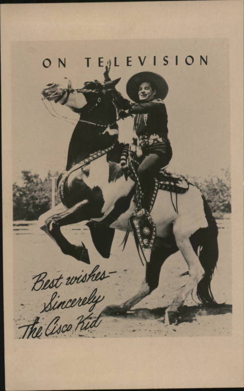 Front: ON TELEVISION Best wishes- Sincerely The Cisco Kid Back: ШРИСТОСКАРН ACTUAL PHOTOGRAPH Famous! CISCO KID CINC JUS POSTAG AT/ FEB-9'59 0:05 OHIO METER 255780 Daird Bookham 44 Twelve Acre Cres. Cove-Farnborough, Hants, England