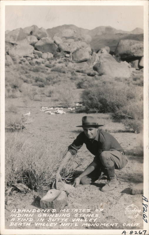 Front: A8267 A. 8267 ABANDONED METATES OR INDIAN GRINDING STONES, A FIND IN BUTTE VALLEY Frashers FOTOS 4. CALE ORA DEATH VALLEY NATL MONUMENT CALIF Back: Pub. by Frasher's, Inc., Pomona, Calif. 48267
