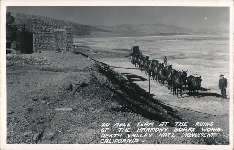 Front: 20 MULE TEAM AT THE RUINS OF THE HARMONY BORAX WORKS DEATH VALLEY NATL MONUMENT CALIFORNIA Back: PUBLISHED BY FRASHERS, INC., POMONA, CALIF. 1