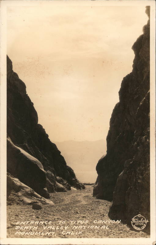 Front: ENTRANCE TO TITUS CANYON DEATH VALLEY NATIONAL MONUMENT CRU CALI Frashers FOTOS CALIF Back: Pub. by Frasher's, Inc., Pomona, Calif. K