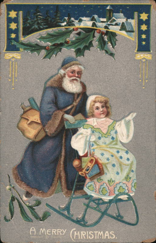 Santa Claus in Blue Robe Pushing Girl on Sleigh