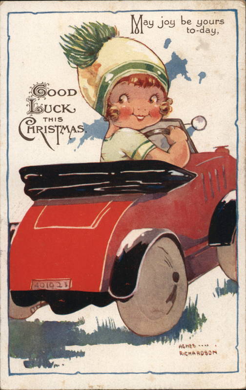 Front: GOOD LUCK CHRISTMAS 401021 May joy be yours to-day, AGNES RICHARDSON Back: Made in Great Britain. "NATIONAL" SERIES. CORRESPONDENCE. TRADE 3419 MARK HERE.