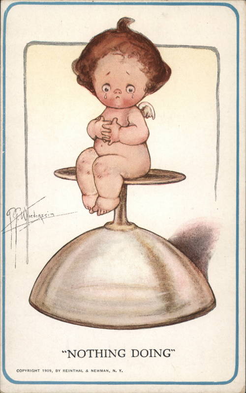 Front: "NOTHING DOING" COPYRIGHT 1909, BY REINTHAL & NEWMAN, N. Y. Back: Published by Keinthal & Newman, N. T. Chas. H. Haup, London, Eng. THIS SPACE CORR AY BE USED FOR NDENCE as Id 7750