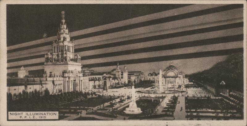 Front: NIGHT ILLUMINATION P. P. I. E., 1915 Back: MAILING CHIRARDELLY CHOCO MADE INSTAN POSSESSIONSĀ¢ 2Ā¢ Set of 20 Panama-Pacific International Exposition Views Published for Ghirardelli's Milk Chocolate 4- Ri OL